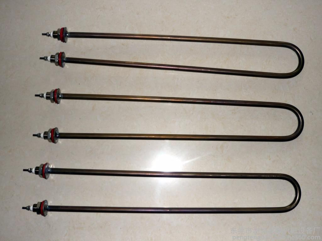 U型電熱管是在無(wú)縫金屬管(碳鋼管、鈦管、不銹鋼管、銅管)內(nèi)放入電熱絲,并在空隙部分緊密地填充有良好的導(dǎo)熱性和絕緣性的結(jié)晶氧化鎂,電熱絲兩端是通過(guò)兩個(gè)引出棒與電源相接,空隙部分填滿有良好導(dǎo)熱性和絕緣性的氧化鎂粉后縮管而成,因電熱管彎曲像因?yàn)橛⑽淖帜窾所以稱(chēng)為u型電熱管。